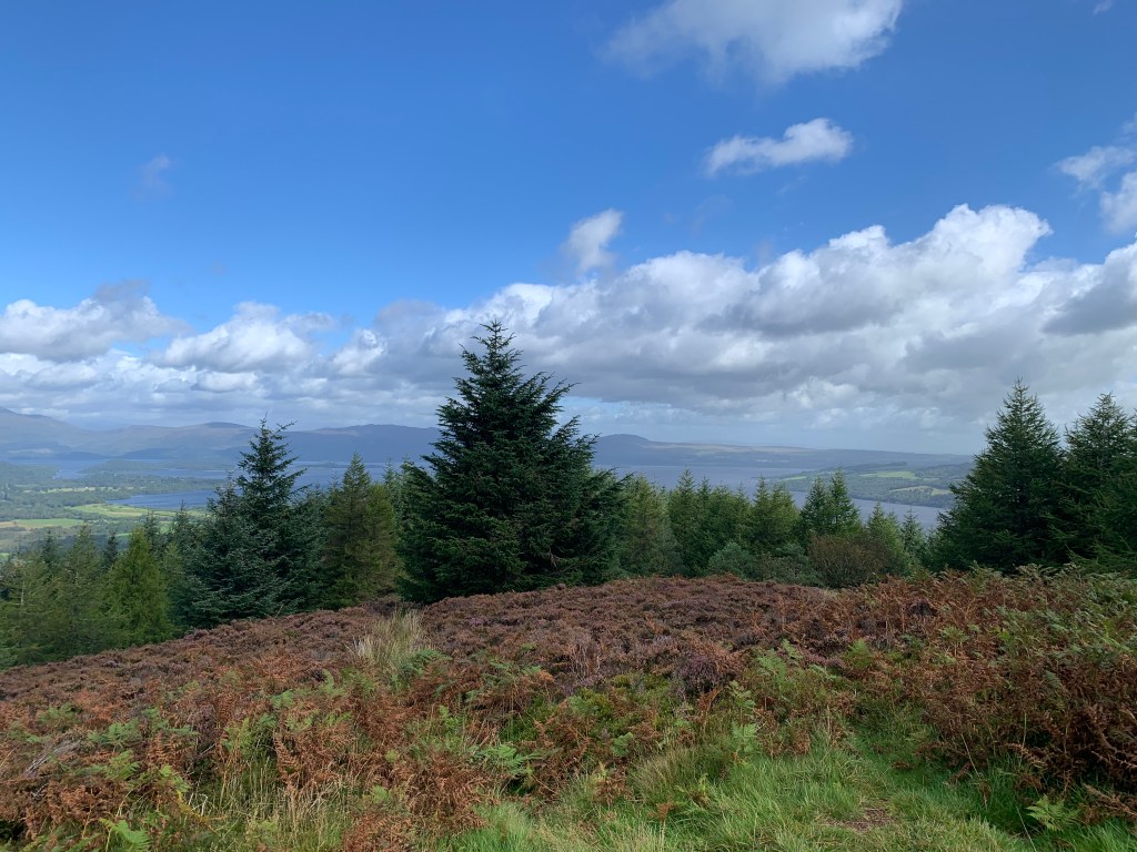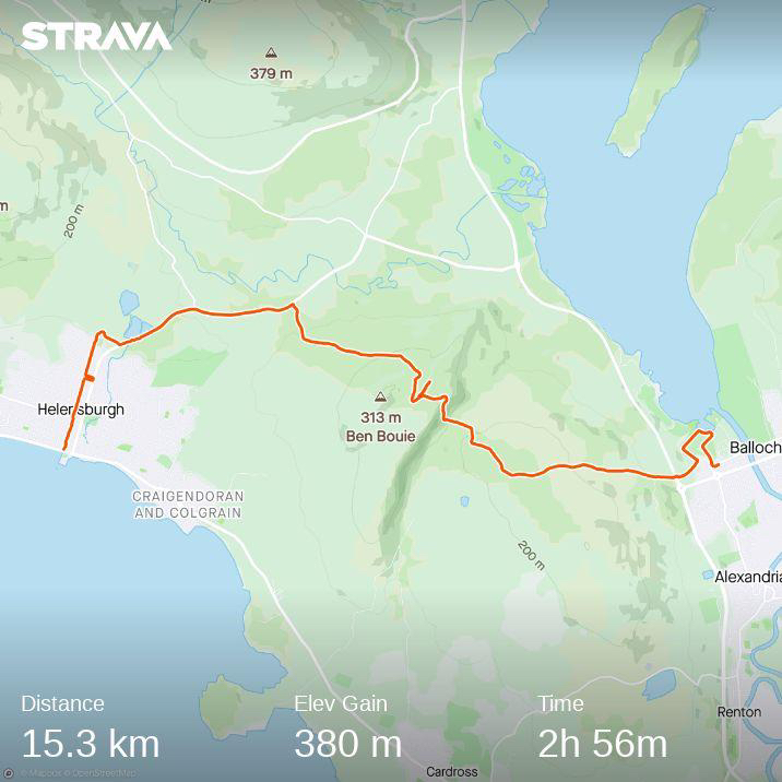 Then it was off up the way past Hill House (one of Charles and Margaret Mackintosh’s most famous works which we’d visited the day before) and out of town to the fields and forests. The views opened up during the climb around the flanks of Ben Bowie to Gouk Hill. Pausing on top to take in the view of Loch Lomond before heading down the other side, descending on an old ‘coffin road’ (where people used to carry their dead to old consecrated ground) before heading into Balloch and the shores of Loch Lomond. A beautiful, bright, blustery day. 9 miles down, 491 to go…