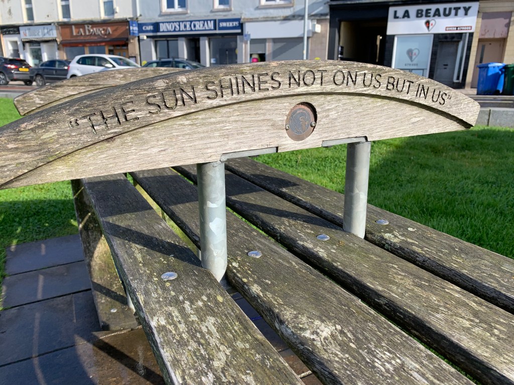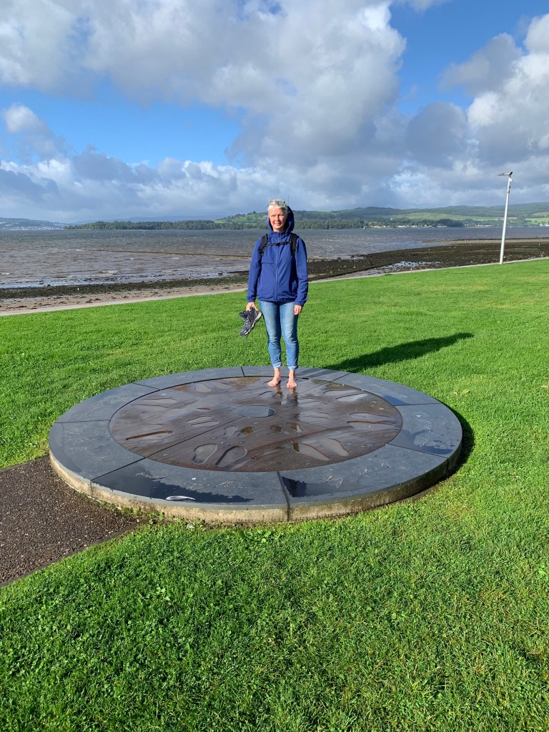 Step 1 of a 500 mile journey. It feels like a long road ahead but fully intending to enjoy the journey as much as the destination. The start point was Helensburgh, the furthest point West on the John Muir Way. Accompanied by mum, we headed to the waterfront to the official start point and dipped our feet in the sea. Pretty sure dad was around as I sat to put my socks back on then looked at the inscription on the bench I’d sat on – “The sun shines not on us but in us.”