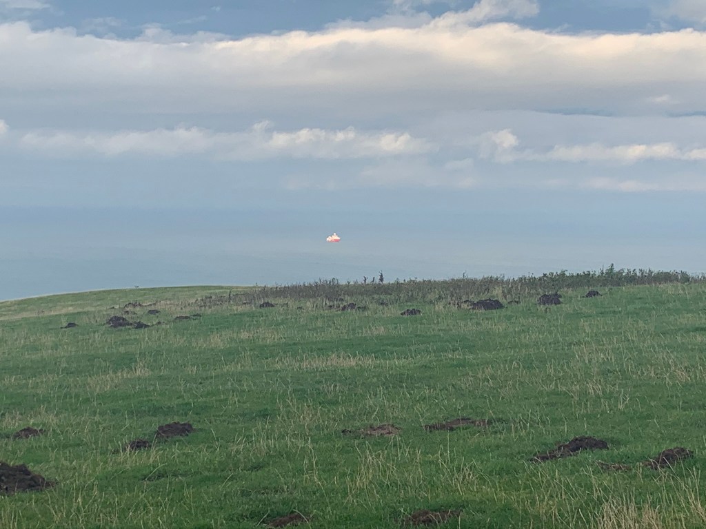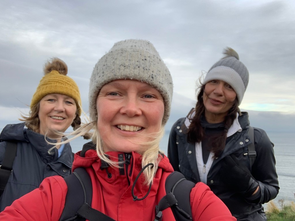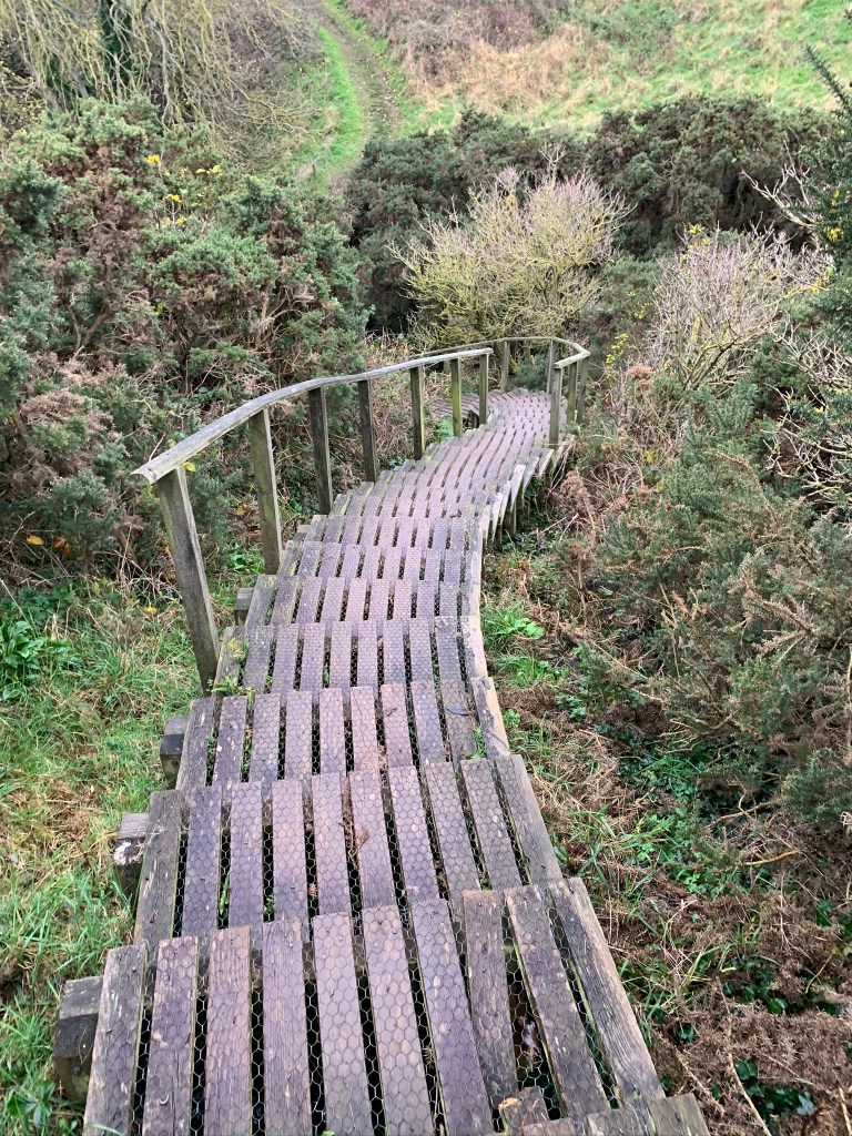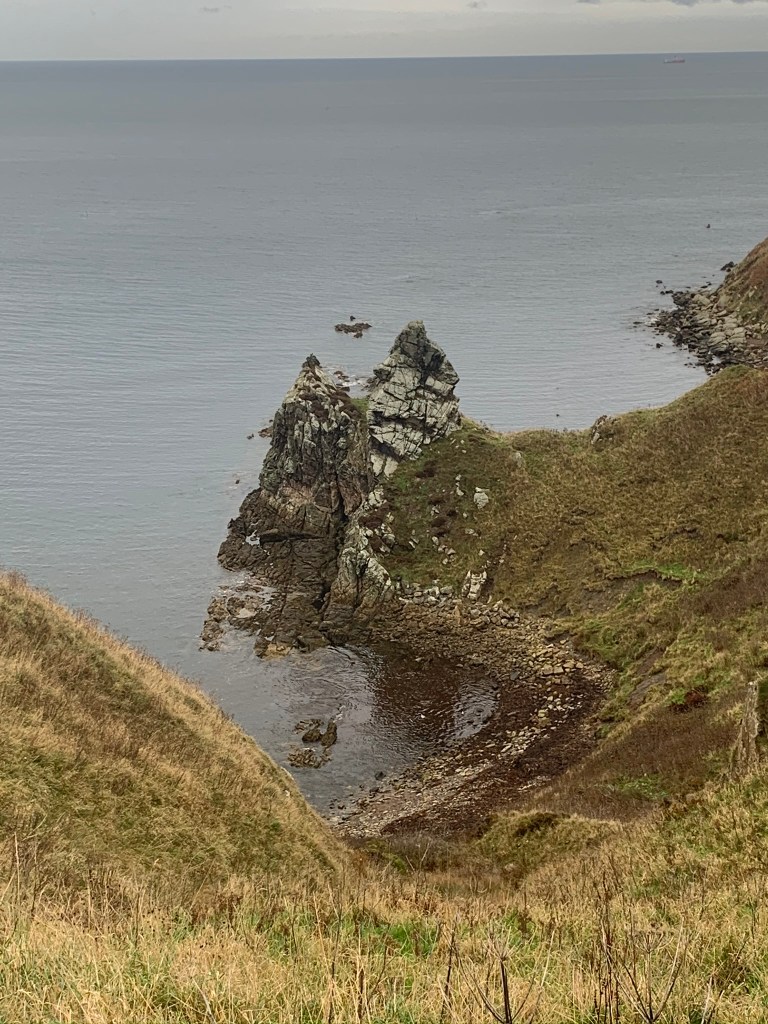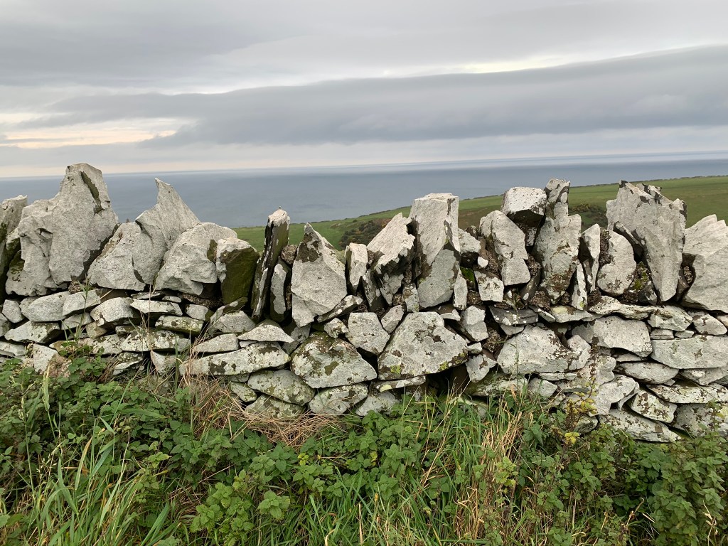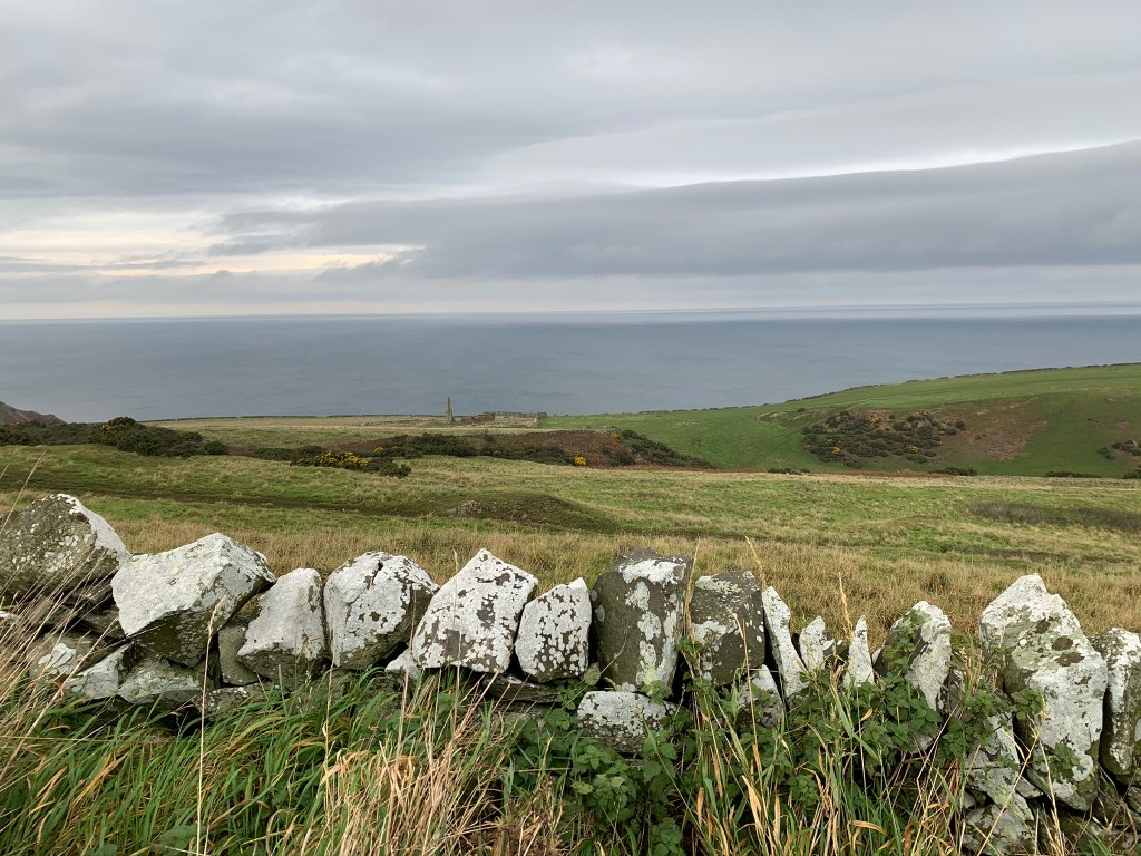 The path then took us inland and uphill. And whilst we didn’t want to leave the sea, the views back down the way were worth it. We stopped for lunch to sit on the soaking grass in the middle of a field then managed to get lost making our way around the next field.