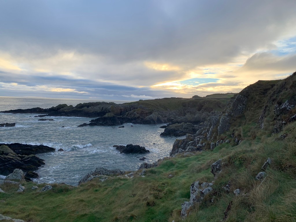 We were sent on our way from Eyemouth by a beautiful bevy of swans. Our first stop was Gunsgreen House which Shirley has claimed as her own – built in 1753 for a local merchant involved in the smuggling trade at the time. Then we were up and out along the edges of Eyemouth Golf Club. There are so many golf courses claiming the best of the land dotted along these coastal walks – I now understand why people (J!) spend so much time on the golf course.
