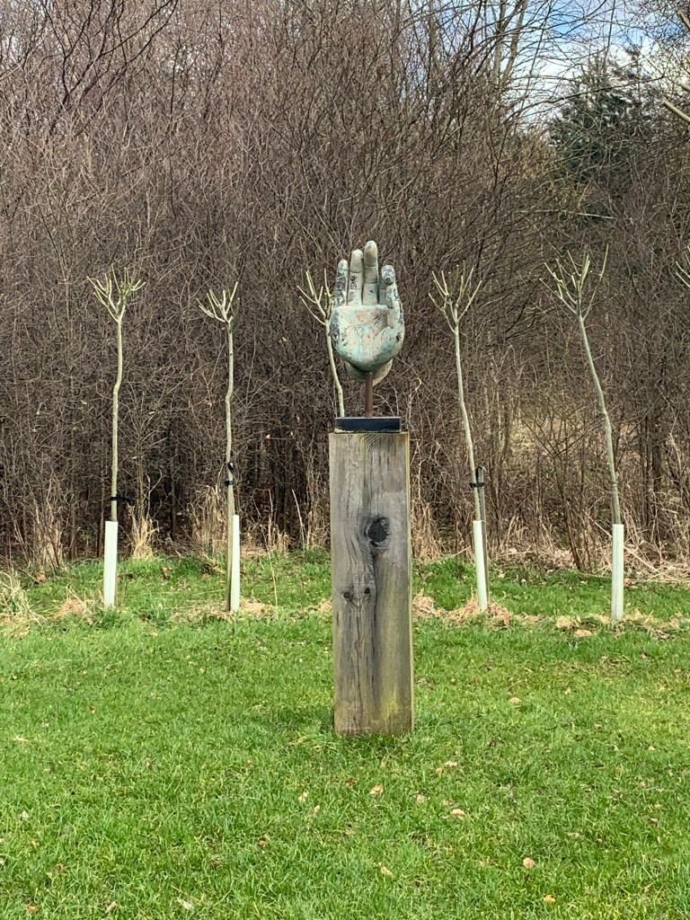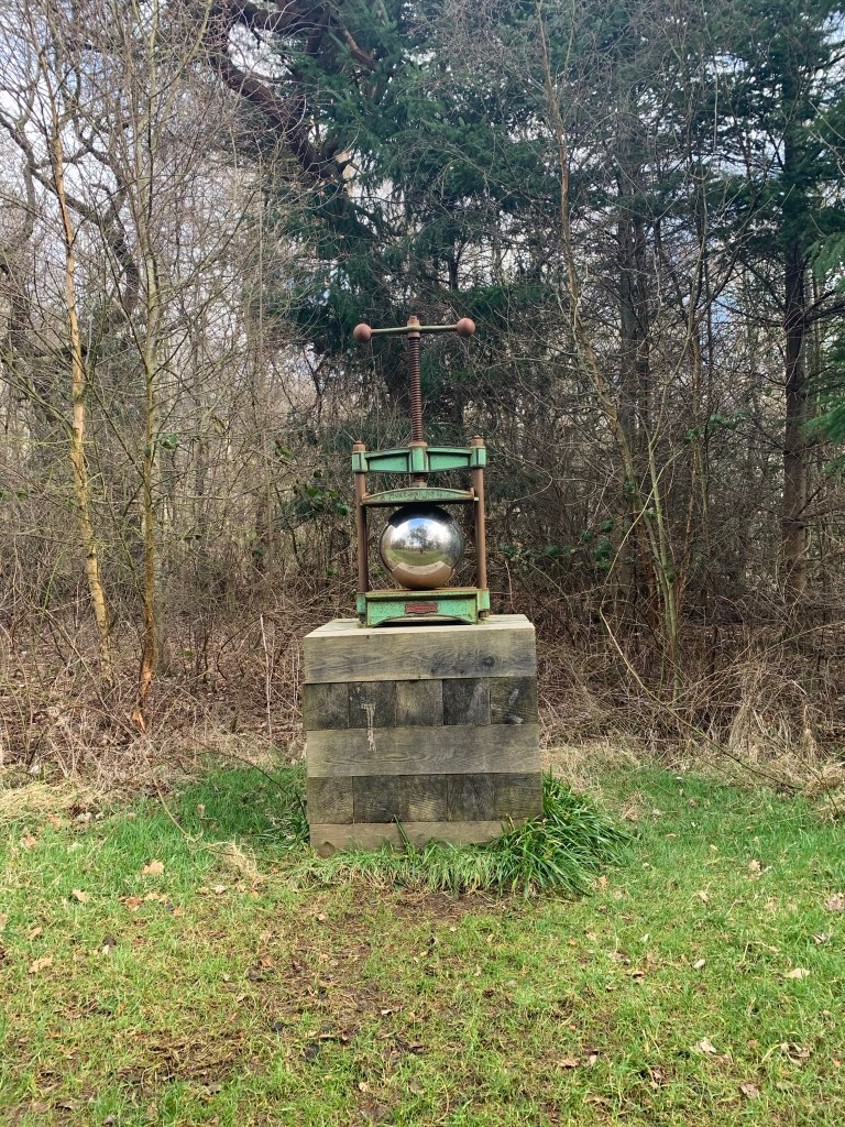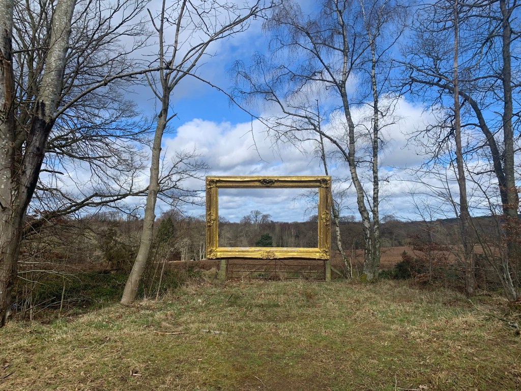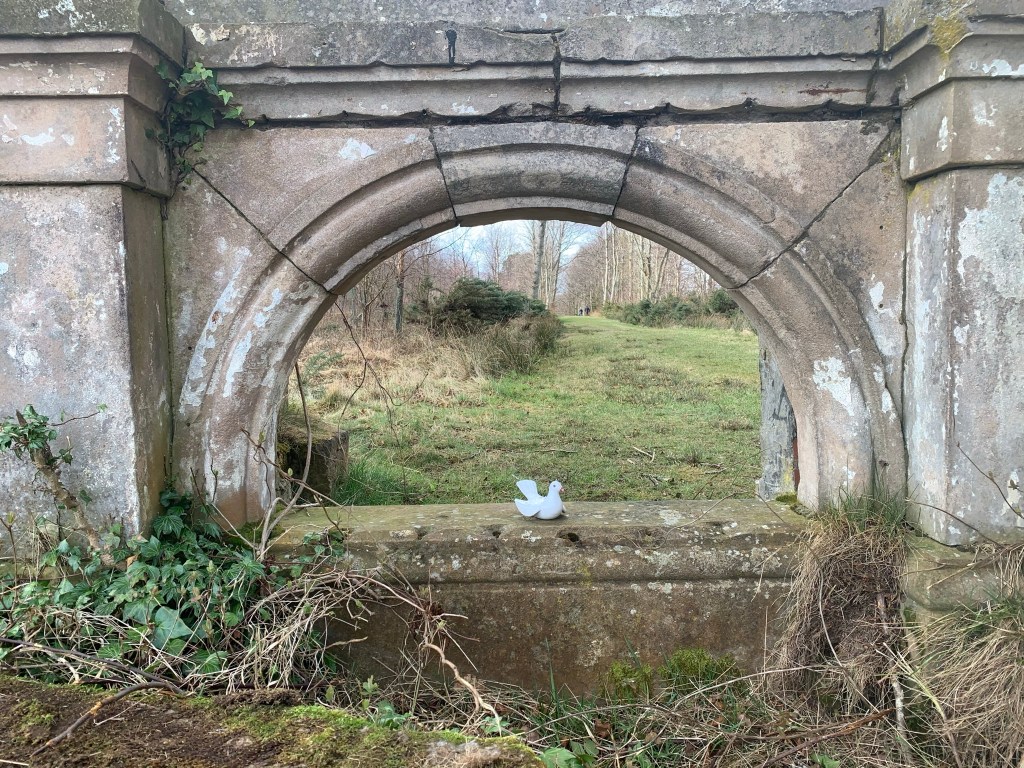 However, I decided to add on a small circuit around Broadwoodside at the end which soon cheered me up. The owners of the farmhouse (the Dalrymples) have turned the mostly derelict buildings into a beautiful home and gardens. And to make the surrounding landscape more interesting have added in Jupiter Artland type sculptures and points of interest around the pathways. The first sign of this was a golden hare, closely followed by a couple of white porcelain birds on a ruined portico, the head of Holloway, a sphere in an ice crusher, a sculpted hand and all finished off with a stop sign. Stop worrying.