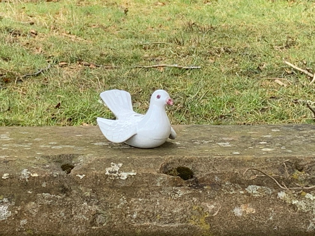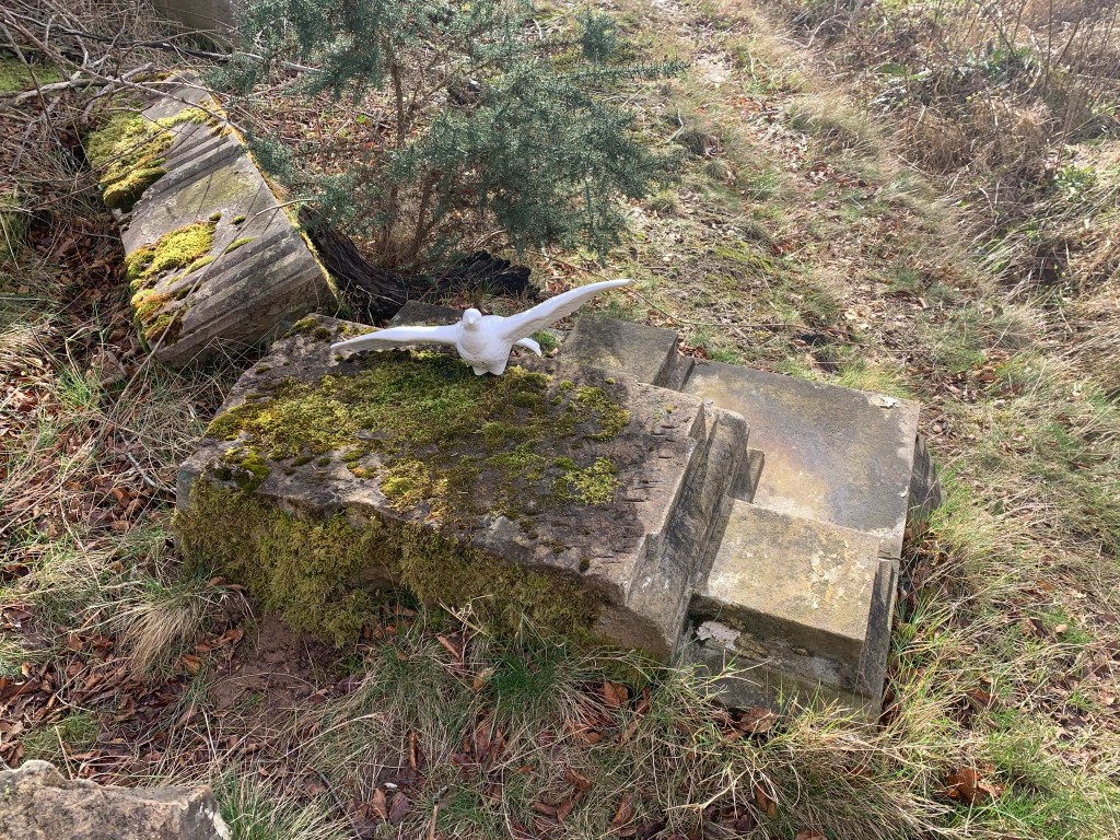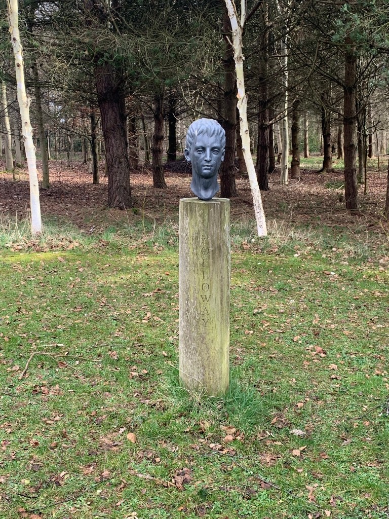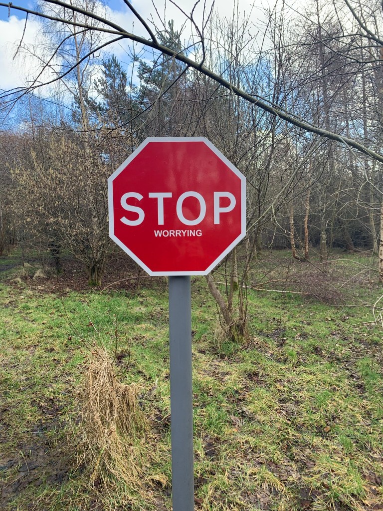 However, I decided to add on a small circuit around Broadwoodside at the end which soon cheered me up. The owners of the farmhouse (the Dalrymples) have turned the mostly derelict buildings into a beautiful home and gardens. And to make the surrounding landscape more interesting have added in Jupiter Artland type sculptures and points of interest around the pathways. The first sign of this was a golden hare, closely followed by a couple of white porcelain birds on a ruined portico, the head of Holloway, a sphere in an ice crusher, a sculpted hand and all finished off with a stop sign. Stop worrying.