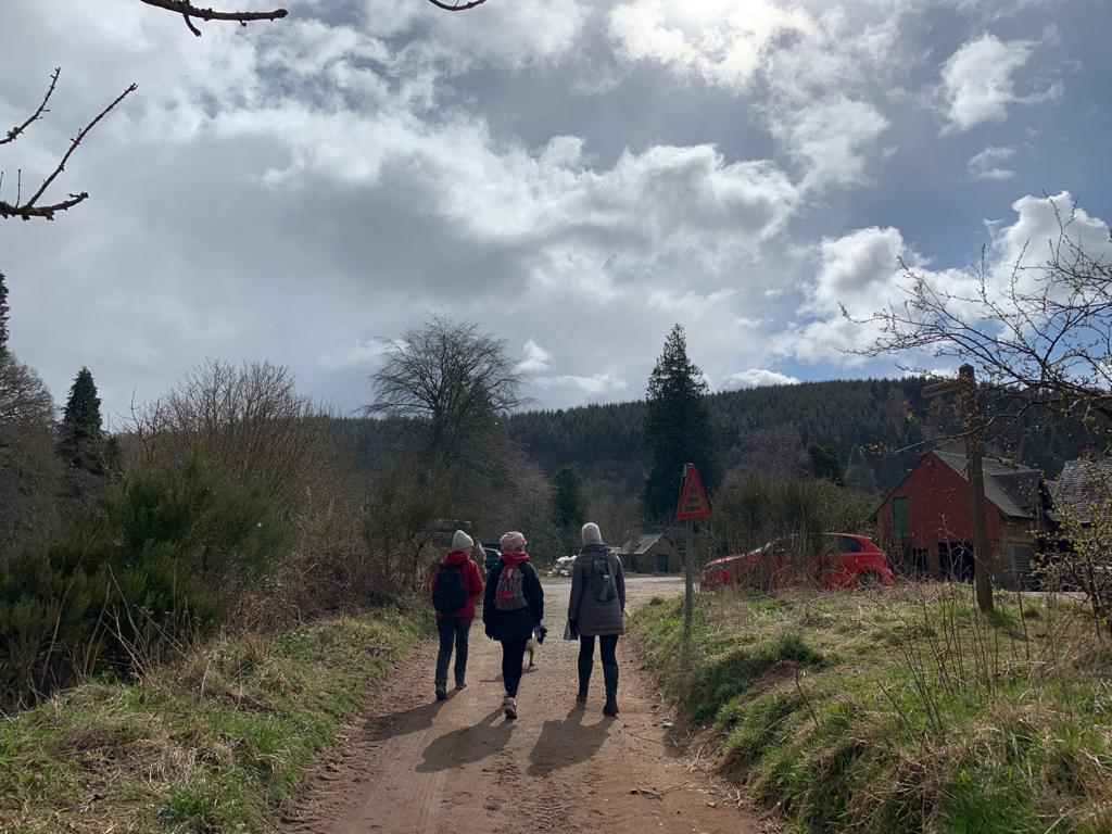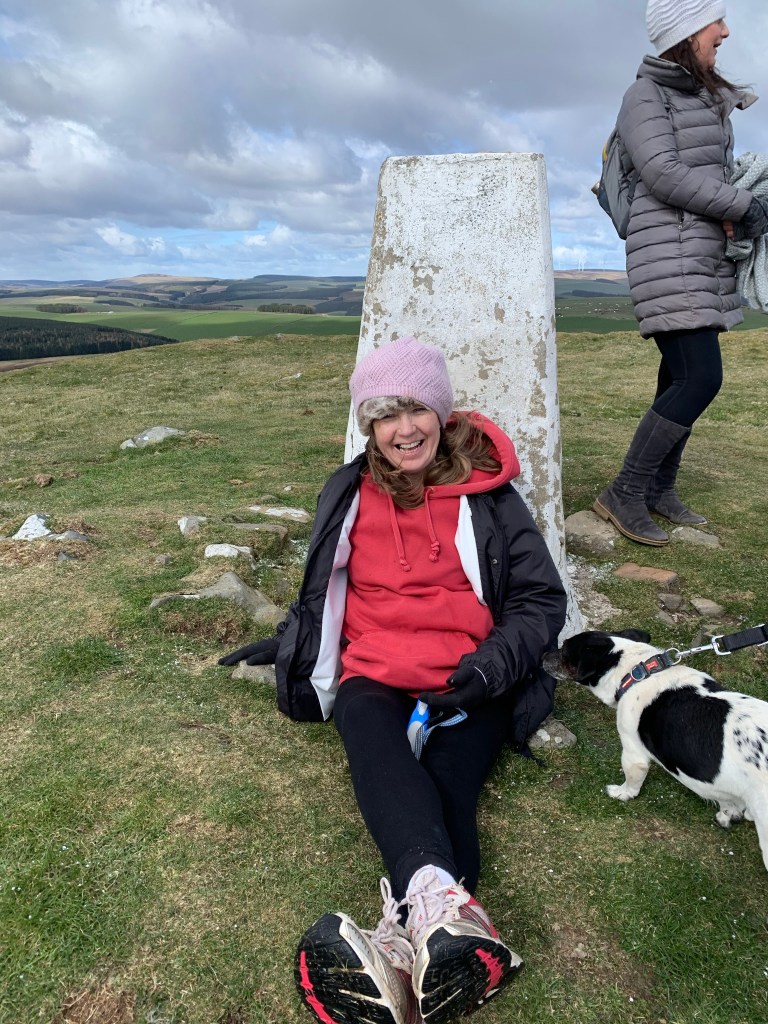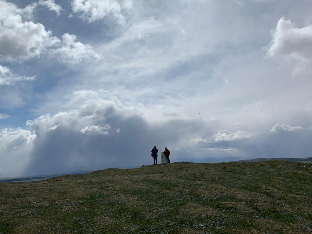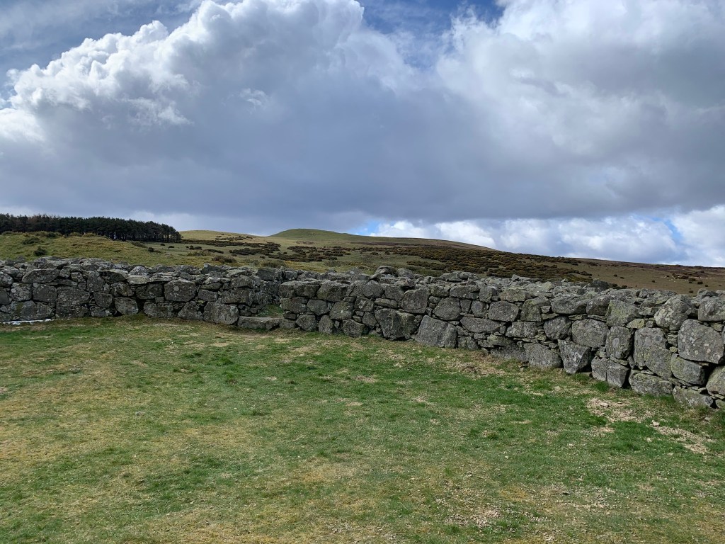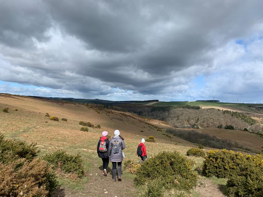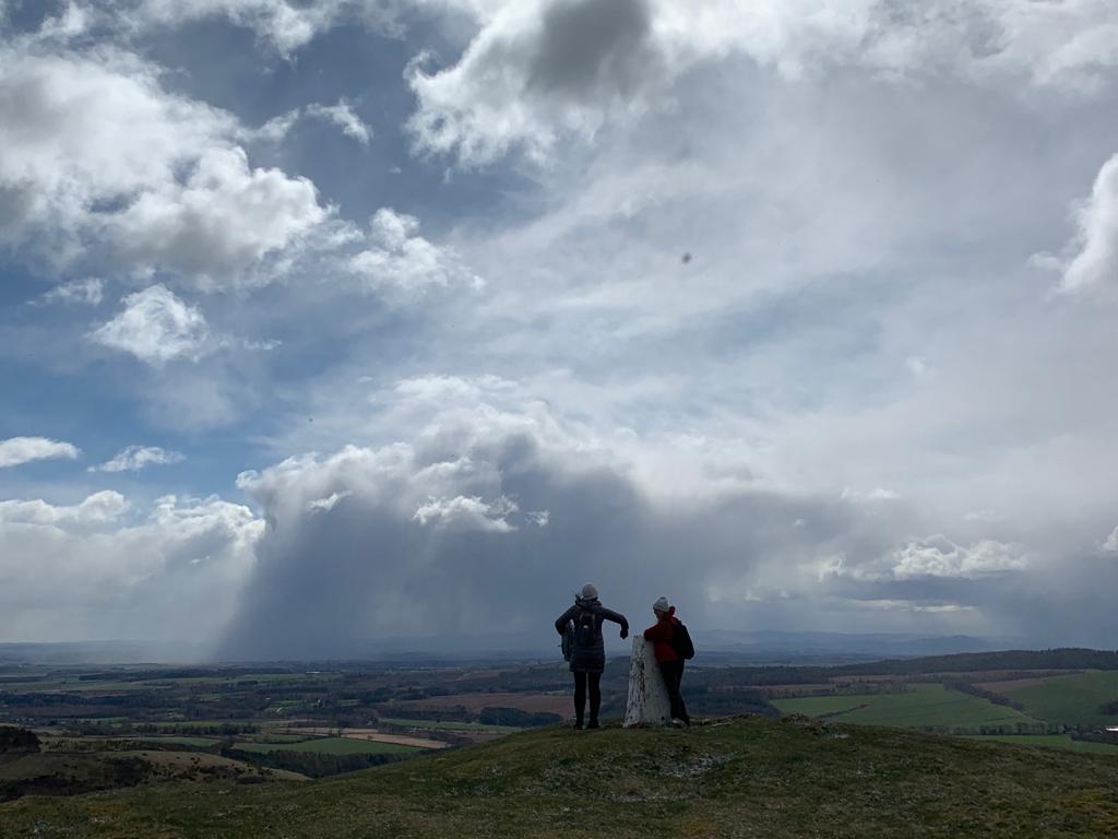 After a beautiful drive through country lanes, we arrived in the little/tiny village of Abbey St Bathans – originally a priory established in the 12th century. And set off along the Whiteadder Water. We took a left at ‘Toot corner’ aiming for the Broch but decided to take a detour to climb to the top of Cockburn Law to take in the views. The weather was feeling particularly wild and undecided so after a short stop being buffeted around at the top we headed back down. We did get lost for a while in the gorse bushes (blind leading the blind) but eventually made it to the Broch itself.